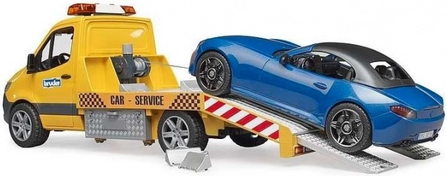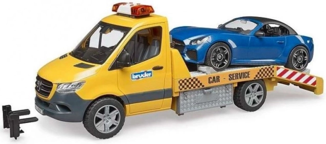 Vlečno vozilo BRUDER na osnovi MB Sprinter navduši z dovršeno izdelavo in bogato funkcionalno opremo. Otroke razveselijo rotacijska luč s svetlobo in zvokom, realistična rampa z izvlečnimi drsniki in zapornimi klini ter odpirajoča se vrata in stranske omarice. Del kompleta je športni kabriolet z odstranljivo streho in zamenljivimi kolesi.
