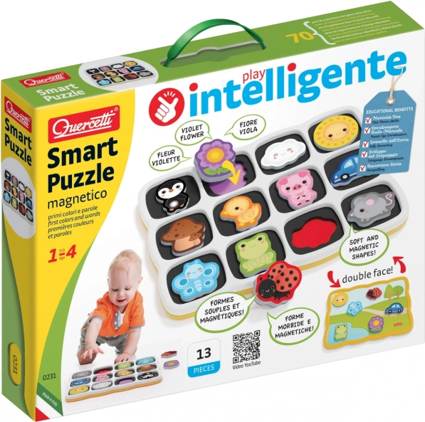 Quercetti Smart Puzzle Magnetico je idealna igrača za najmlajše otroke, ki ni le zabavna, temveč tudi izobraževalna. Ta igriva set, namenjen otrokom od 12 mesecev, vsebuje tablo z 12 magnetnimi koščki, ki jih je mogoče preprosto vstaviti v pripravljene odprtine, s čimer se spodbuja prepoznavanje oblik in barv.