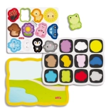 Tabla omogoča ne samo vstavljanje koščkov v pripravljene odprtine, temveč ponuja tudi prosto površino za ilustrirane zgodbe.