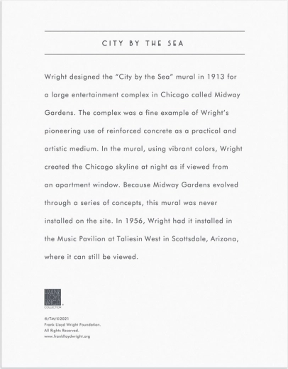 Ta čudovita sestavljanka prinaša v vaš dom ikonično umetnost Franka Lloyda Wrighta. Stenska poslikava »City by the Sea« je bila zasnovana leta 1913 za zabaviščni kompleks v Chicagu in velja za pionirski primer uporabe armiranega betona v umetnosti. Sestavljanka ujame to poslikavo skozi okno stanovanja in vključuje podrobnosti poudarjene s folijo, kar zagotavlja nov pogled na to ikonično delo.
