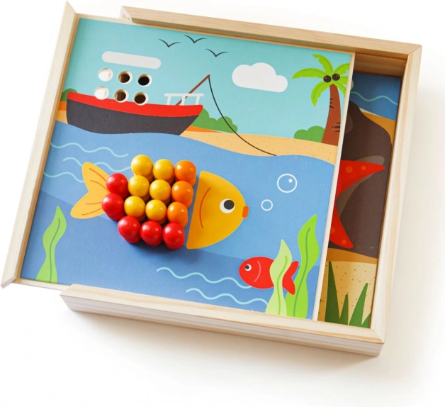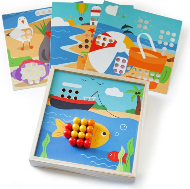 Odkrijte zabavno mozaiko z motivi plaže, ki razvija otrokovo domišljijo in spretnosti. Vsebuje 4 slike in 96 zatičev v 8 barvah, ki jih otroci zlagajo na pokrov praktične škatle. Igra spodbuja prepoznavanje barv, fino motoriko, zbranost in logično razmišljanje. Izdelano iz kakovostnega, odgovorno pridobljenega lesa – prijetno na dotik in idealno za na pot.