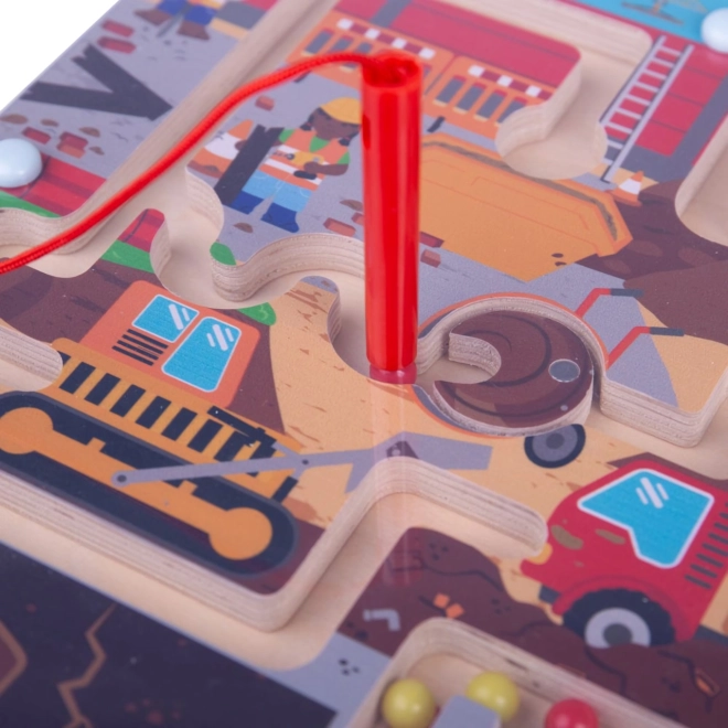Ta kakovosten lesen magnetni labirint z motivom gradbišča razveseli otroke od 3. leta dalje. S priloženim magnetnim kazalnikom otroci premikajo barvne kroglice med bagri, tovornjaki in ovirami, urijo logiko in prostorsko zaznavo ter se hkrati odlično zabavajo.