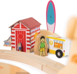 Ta obalna vlakovna proga prinaša veliko domiselne zabave in učenja v enem. Otroci se lahko vozijo po progi, prečkajo velik peščeni grad, se peljejo mimo pisanih plažnih hišk in se ob tem učijo ločevati odpadke s pomočjo praktičnih magnetnih zapiralnih plošč. Vse v kakovostni izvedbi iz odgovorno pridobljenih materialov z varnimi barvami in laki.