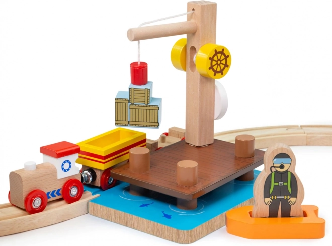 Ta pristaniški komplet bo vaši vlakovni progi dodal realistično vzdušje. Delujoč žerjav z magnetom varno prenaša tovor med dokom, vagončki in čolnom, medtem ko je figurica potapljača pripravljena na vsako reševalno akcijo. Robustna lesena izdelava zagotavlja dolgo življenjsko dobo in varno igro.