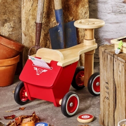 Ta poganjalec je izdelan iz trpežne vezane plošče in masivnega lesa, kar zagotavlja robustno in varno konstrukcijo. Poleg tega ima omejen kot zasuka krmila za večjo stabilnost. Plastična kolesa z vzdržljivimi pnevmatikami so zasnovana za dušenje hrupa in zagotavljanje gladke vožnje.