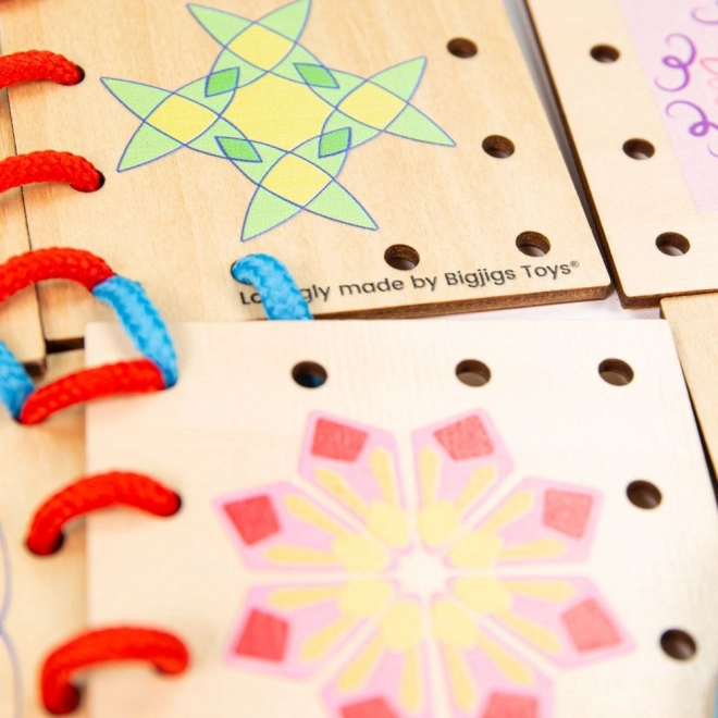 Prebadate, ustvarjajte in kombinirajte! Lesene ploščice z perforacijo in živahnimi vzorci so idealen pripomoček za prve korake v “šivanju” in nizanju. Otroci se skozi igro učijo pravilnega prijema, zbranosti in logičnega razmišljanja, hkrati pa ustvarjajo izvirne “patchwork” kolaže.