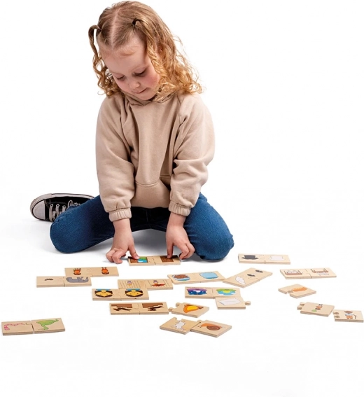 Otroci povezujejo slike, ki sodijo skupaj kot nasprotna pomena – na primer dan in noč, toplo in hladno, žalosten in vesel. Gladki, robustni koščki se zlahka držijo in sestavljajo, zato se lahko majhne roke osredotočijo na odkrivanje novih besed in povezav.