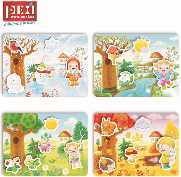 Kdaj delaš snežne kepe? Kdaj lahko greš v gozd nabirat gozdne sadeže in gobe? Set vsebuje 4 velike prožne plastične ploščice z ježkom ter 20 samostojnih koščkov, ki jih na ploščice namestite z ježkom. Zahvaljujoč tej domislici posamezni deli ne bodo tako zlahka odpadli in bodo ostali na pravem mestu.