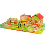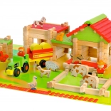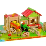 Ta sestavljanka spodbuja otroško ustvarjalnost in jim omogoča, da si ustvarijo lastno kmetijo z rdečo streho, zelenim traktorjem in številnimi živalmi.