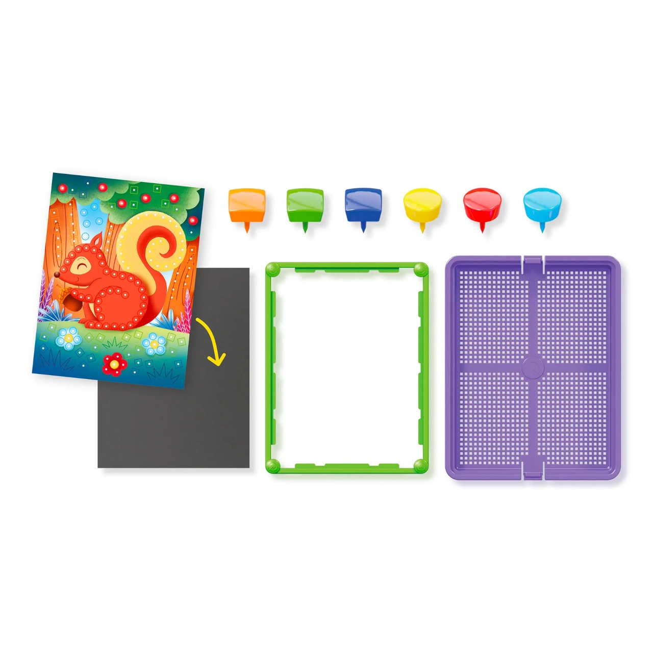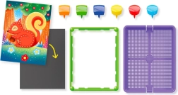 Komplet vsebuje vse potrebno: od ilustracij z gozdno tematiko (lisica, veverica, sova idr.) do bogatega nabora žebljičkov ter praktičnega koša, v katerega po igri vse preprosto pospravite. Odlično za igro doma in predšolske dejavnosti.
