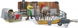 Set vsebuje podrobne figurice kmeta, krave in teleta, ki omogočajo otrokom realistično posnemanje življenja na kmetiji.