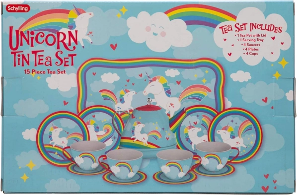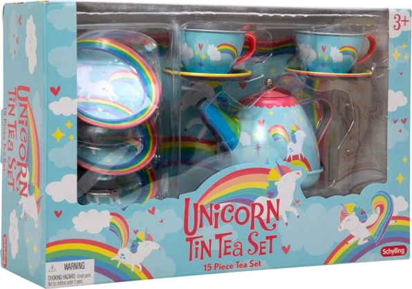 Prisrčen čajni komplet z motivom enoroga bo razveselil male gostiteljice in gostitelje. Vsebuje 15 delov iz trpežne kovine – skodelice, krožničke, krožnike, čajnik s pokrovčkom in servirni pladenj 24 × 16 cm. Idealno za igro domišljijskih čajank ter razvoj kreativnosti in socialnih veščin. Primerno za otroke od 3 let.