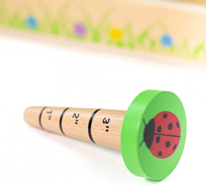 Ta barvit vrtnarski set razvija otroško spretnost, potrpežljivost in odnos do narave. Vse je shranjeno v trdnem lesenem zabojčku s svežim zelenim dizajnom z pikapolonicami in cvetlicami. Otroci se lahko varno preizkusijo v sajenju, rahljanju ali merjenju in pri tem posnemajo odrasle.