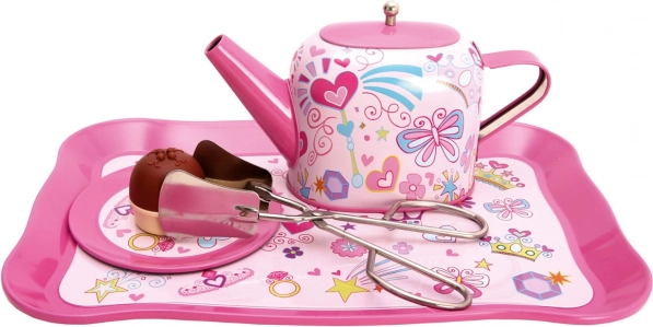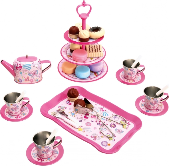 Čas za čarobni čajni piknik! Ta bogat otroški čajni set ponuja vse za zabavno pogostitev s starši, punčkami in pliškoti. Set je podrobno okrašen, izdelan iz trpežne lahke kovine in neoporečne plastike ter spodbuja domišljijo, sodelovanje in komunikacijske veščine. Vsebuje servis za 4 osebe in skupaj 35 delov, vključno s stopničastim stojalom za sladkarije.