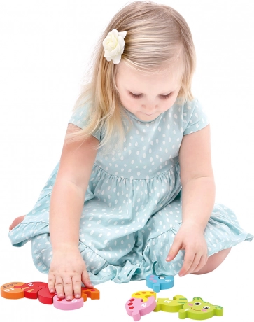 Barvita lesena sestavljanka v obliki gosenice otrokom na igriv način pomaga osvojiti zaporedje in osnovne številke. Robustni koščki so lahko oprijemljivi, živih barv in ohranjajo pozornost. Izdelana je iz masivnega lesa z varnimi barvami, priložena v praktični tubi z zanko za lažje prenašanje.