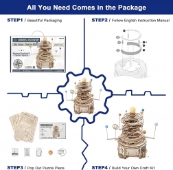 Ta podroben leseni model Osončja združuje zabavo pri sestavljanju s pametno mehaniko. Zahvaljujoč premišljenemu sistemu zobnikov ORRERY mehanizem simulira različne hitrosti kroženja planetov okoli središča – Sonca z LED osvetlitvijo, ki zasveti ob ročnem vrtenju kljuke.