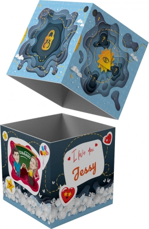 V paketu najdete vse potrebno: škatlico, ključavnico, 4 kartice z namigi, 3 pole dekorativnih nalepk in 5 opisljivih visečk za personalizacijo. Notranji predal z merami 11,5 × 11,5 × 10,5 cm sprejme drobno darilo, darilni bon ali osebno sporočilo. Izdelek je izdelan v EU in dopolnjen s slikovnimi navodili v angleščini in nemščini.