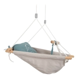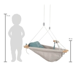 Tkanina ležalne površine se optimalno prilagodi obliki telesa otroka in je enostavna za vzdrževanje. Lesena konstrukcija je izdelana iz kakovostnih naravnih materialov, ki poudarjajo ekologijo in varnost. Nosilnost gugalnice je do 30 kg, kar zagotavlja dolgotrajno uporabo.