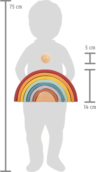 Ta lesena mavrica ponuja odlično priložnost za otroke, da razvijajo svojo domišljijo in motorične spretnosti. Vsebuje 8 barvnih lokov in leseno kroglico, ki lahko služi kot učni pripomoček za razumevanje dimenzij in barv. Igrača je izdelana v skladu z Montessori pedagogiko in je idealna za prosto igro.