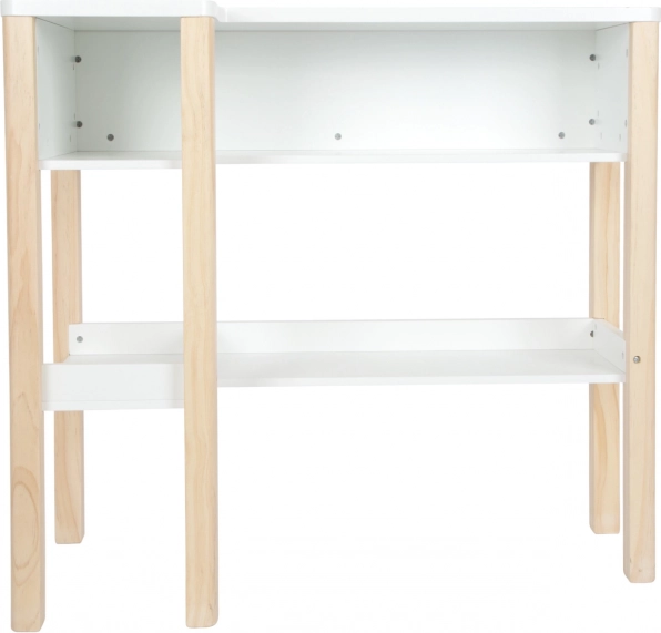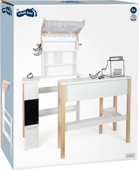 Lesena prodajna stojnica SMALL FOOT Fresh bo otroško sobo spremenila v majhno tržnico. Minimalističen videz v beli in naravnem lesu se poda v vsak interier, odstranljiva črtasta tenda pa ji daje avtentičen videz trgovine. Piši-briši tabla s poličko za kredo vabi k ustvarjanju napisov in cenovk.