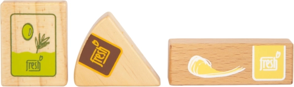 Komplet vegetarijanske hrane Fresh prinaša otrokom vse, kar potrebujejo za ustvarjalne kuharske in trgovske igre. Leseni kosi, kot so mleko, maslo, sir, olje, jajca, riž, testenine, pekovsko pecivo, jabolko, paradižnik, kumara in korenje, dopolnjuje plastenka vode in čajna vrečka. Realistične podrobnosti, vključno z okencem na embalaži riža in testenin (ob tresenju oddajata zvok), povečujejo privlačnost in pristnost igre.
