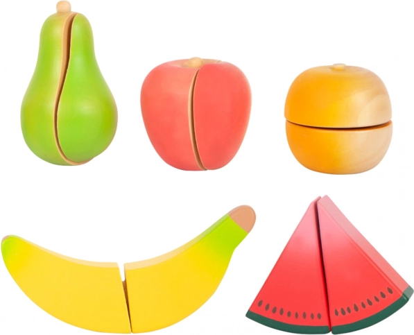 - Vsebina kompleta: deska, lesen nož, jabolko, hruška, pomaranča, banana, kos melone, večkrat uporabna embalaža