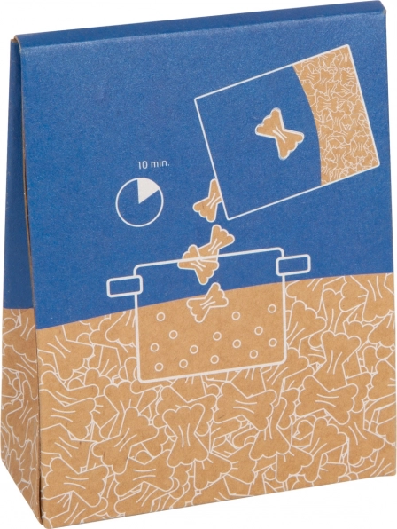 Kartonasta škatlica se zlahka odpira in zapira, na zadnji strani pa ponuja razumljiv slikovni postopek “kuhanja”.