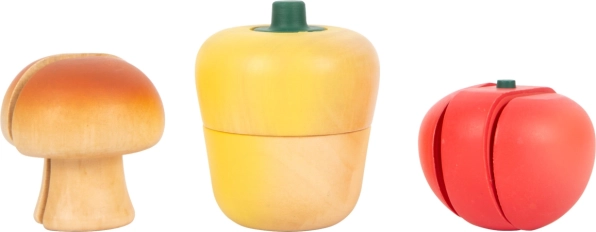 Paradižnik, paprika, kumara, korenje in šampinjon so razdeljeni na polovice in držijo skupaj s sprijemalnim trakom – idealno za vadbo varnega rezanja.