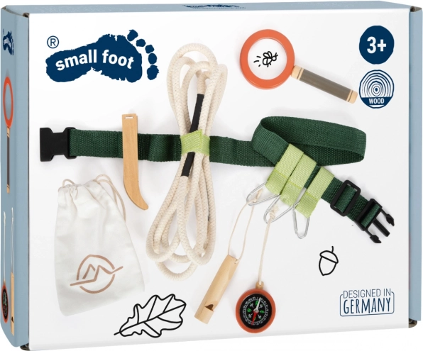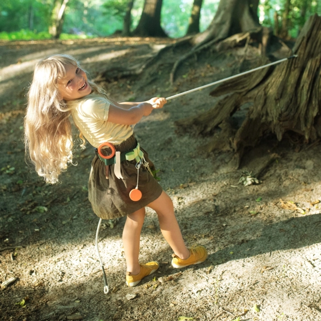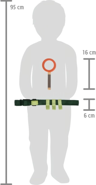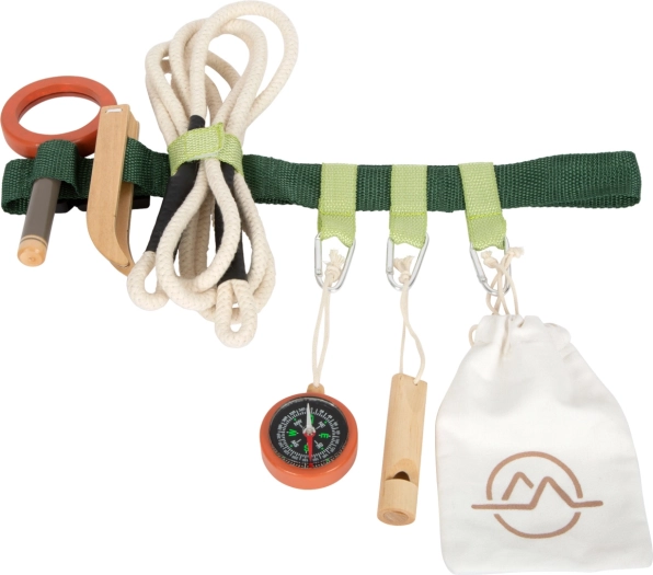 Podajte se na nepozabne pustolovščine s pasom, polnim opreme. Otroke bo navdušil vzdržljiv pas, ki vključuje leseno piščalko, lupo, pinceto, kompas, vrv in tekstilno vrečko. Vse je enostavno pritrditi s pomočjo obročkov in karabinov.