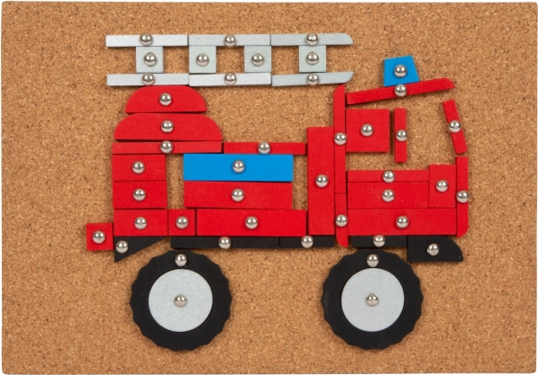 Obsežen ustvarjalni komplet s prometno tematiko, ki vsebuje pluto podlogo, leseno kladivo in mnogo lesenih delov različnih oblik in barv. Pomaga razvijati ustvarjalnost, spretnost ter koordinacijo roke in očesa.