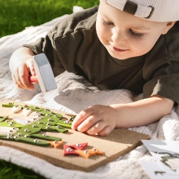 Ta zabijalska igrača je idealna za male raziskovalce z domišljijo. Razvija motorične spretnosti in spodbuja ustvarjalnost pri otrocih. Set vsebuje koščke različnih oblik in barv, ki jih je mogoče zlahka zabijati v plutasto podlago.