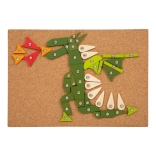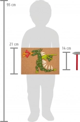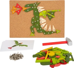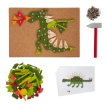 Set vključuje plutasto podlago, leseno kladivo, barvne koščke in žebljičke za ustvarjanje slik.