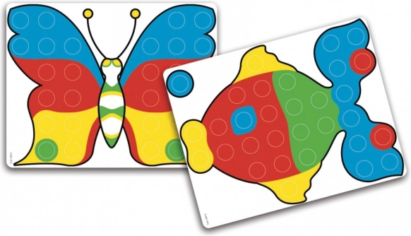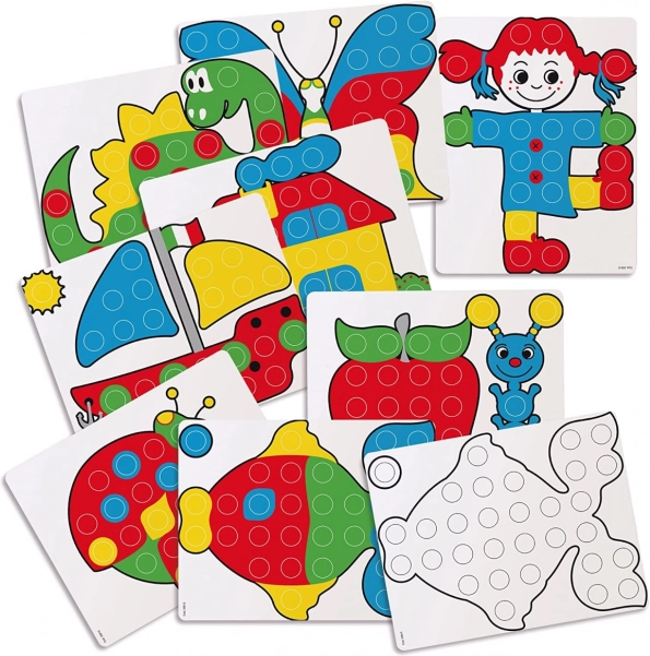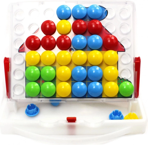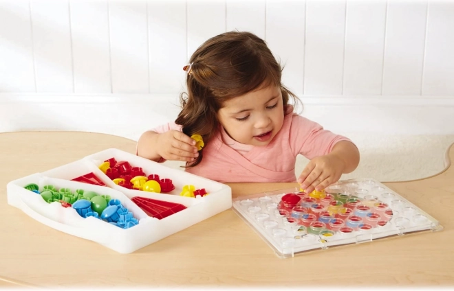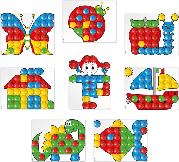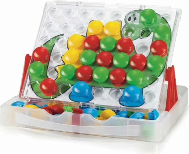 Mozaik v praktičnem kovčku otrokom omogoča sestavljanje veselih slik po priloženih šablonah ali po lastni domišljiji. Ploščo je mogoče vstaviti v opore in jo uporabljati tudi v navpičnem položaju za še udobnejšo igro. Veliki, barviti žebljički so varni in enostavni za prijem tudi za majhne otroške roke.