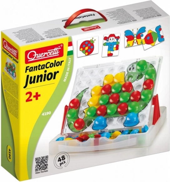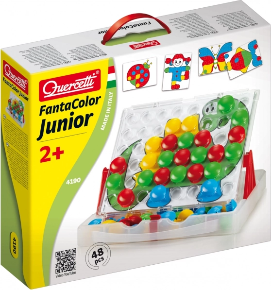 Odkrijte ustvarjalni mozaik QUERCETTI FANTACOLOR JUNIOR, ki razvija otrokovo domišljijo in fino motoriko. Zaradi velikih žebljičkov je rokovanje preprosto, praktični kovček vse drži skupaj, 8 dvostranskih predlog pa navdihuje k ustvarjanju. Igrača podpira prepoznavanje barv, koordinacijo oko–roka, zbranost in potrpežljivost.