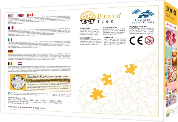 Potopite se v svet sladkih dobrot s sestavljanko Brain Tree Cupcakes, ki ponuja 1000 naključno izrezanih koščkov. Zahvaljujoč mat površinski obdelavi vsak barvni detajl motiva izstopa v vseh svetlobnih pogojih. Vsako pakiranje vsebuje tudi plakat z ustreznim motivom in praktične kartonske pregrade za razvrščanje koščkov.