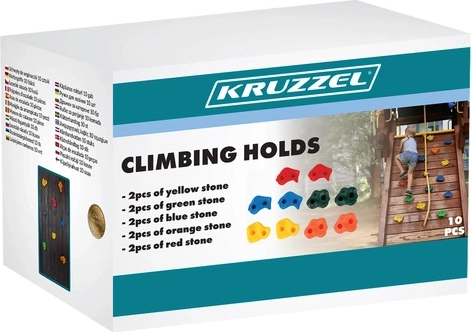 Oprimki KRUZZEL se montirajo z 2 vijakoma, kar preprečuje njihovo vrtenje in povečuje varnost pri uporabi. Teksturirana, protizdrsna površina zagotavlja zanesljivost za roke in noge. Različne oblike in velikosti omogočajo več možnosti prijema glede na način pritiska. Odlični za gradnjo plezalnih sten, lestvenikov, stolpov in drugih konstrukcij.