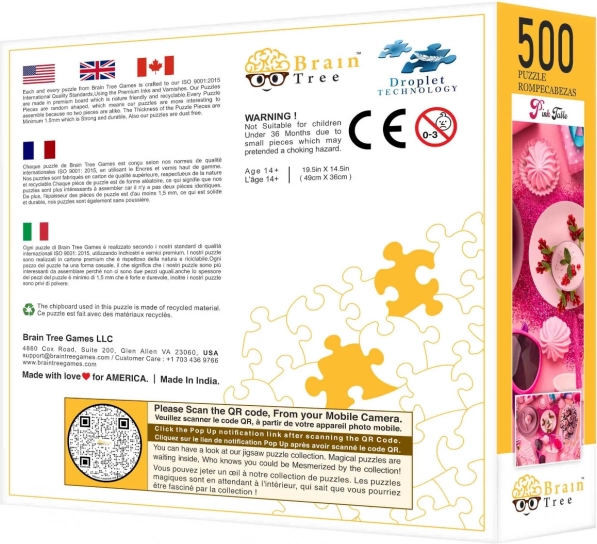 Odkrijte vrhunske sestavljanke Brain Tree z motivom »Rožnato pogrnjeno« s 500 kosi. Uživajte v mat zaključku za popolno vidnost detajlov, naključno rezanih kosih za več zabave in odpornem tisku, ki prenese večkratno sestavljanje. Del pakiranja so plakat, kartonski razdeljevalniki za razvrščanje in stojalo za pokrov škatle za udoben pogled na predlogo.