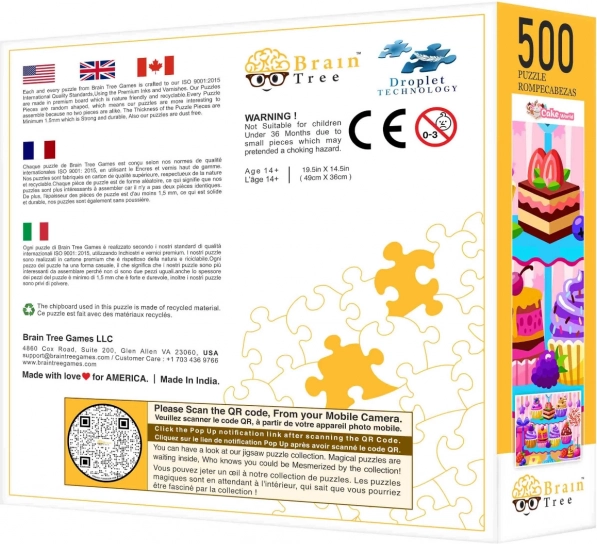 Sestavljanka V Slaščičarni znamke Brain Tree prinaša edinstveno izkušnjo zahvaljujoč naključno rezanim kosom, ki dodajo sestavljanju pridih pustolovščine. Vsak kos je original, kar zagotavlja zabavo pri vsakem sestavljanju. Mat obdelava omogoča lepo prikazovanje tudi ob spreminjajočih se svetlobnih pogojih.