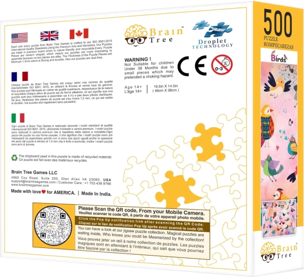 Sestavljanka Brain Tree Pravljične Ptice bo navdušila vse ljubitelje puzzlov s svojo kakovostjo in izvirnostjo. Deli so prijetni na dotik in se ponašajo z visoko odpornostjo proti obrabi, kar zagotavlja dolgotrajno igranje. Za razliko od tradicionalnih sestavljank, kjer so deli rezani v mrežni vzorec, boste tukaj našli kose raznolikih oblik, ki prinašajo nov, pustolovski razsežek sestavljanja.