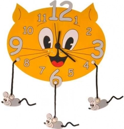 Igrive lesene ure z motivom mačke in miši, ki vam bodo pomagale naučiti otroke občutka za čas. Idealne za obešanje na steno v otroški sobi.