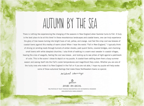 Uživajte v barvitem listju, svetilniku in živahnem pristanišču, ki jih je ujel nagrajeni ilustrator Michael Storrings. Motivi so polni detajlov, ki jih je zabavno odkrivati pri vsakem sestavljanju.