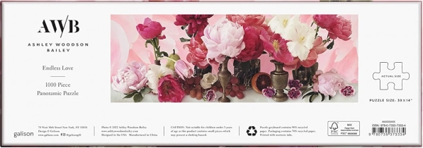 Panoramske sestavljanke Endless Love prinašajo elegantno cvetlično tihožitje, polno tulipanov in potonik v nežnih odtenkih rožnate in zelene. Zaradi vrhunskega tiska in mat površine izstopajo detajli in nasičenost barv, zato je sestavljanje tako lepo kot končna podoba. Avtorica je ameriška umetnica in fotografinja Ashley Woodson Bailey, znana po prefinjenih botaničnih kompozicijah.