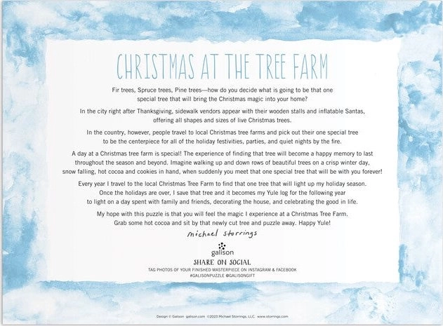Odkrijte čar božiča s sestavljanko GALISON z motivom kmetije, polne božičnih drevesc. Podrobna ilustracija nagrajenega oblikovalca Michaela Storringsa prinaša veselje, barve in praznično vzdušje v vsak dom. Mat površinska obdelava in gladka hrbtna stran zagotavljata prijetno sestavljanje in dolgo življenjsko dobo.