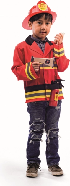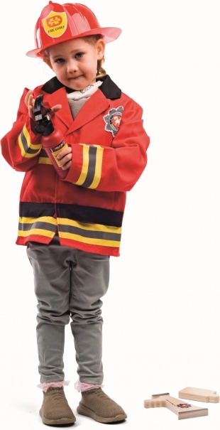 Otroški gasilski kostum BIGJIGS TOYS ponuja vse, kar mali gasilci potrebujejo za napeto reševalno misijo. Svetlo rdeč plašč s črtastimi rokavi in emblemom, nastavljiva čelada (49–55 cm) ter dodatki, kot so lesen gasilni aparat, radijska postaja in megafon, dajejo igri realističen značaj.