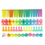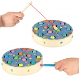 Zaradi velikega števila delov je igra idealna tudi za več otrok hkrati – eden lovi ribice, drugi zbira gosenice, tretji pa razvršča kroglice v silikonske posodice. Varni materiali in gladko brušen les zagotavljajo udobno in brezskrbno igro.