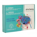 • Različni načini igre: magnetni ribolov ribic in gosenic, prenašanje s pinceto/palčkami, razvrščanje barv, preprosti računski primeri s številkami, vadba štetja v obliki namizne igre.