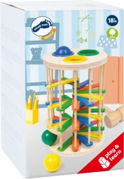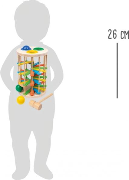 Tolkač stolp s kroglicami od Small Foot je popolna igrača za razvoj motoričnih sposobnosti otrok. Sestavljen je iz stolpa, kjer otroci tolčejo po 3 barvnih kroglicah preko plastičnih obročev in opazujejo, kako kroglice padajo navzdol po stopnicah ter oddajajo klikajoči zvok.