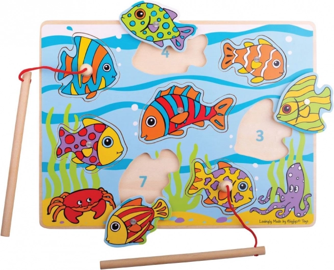 Zabavna lesena igra za najmlajše, pri kateri otroci z magnetno palico lovijo pisane ribice in jih vračajo v prave odprtine. Spodbuja fino motoriko, koordinacijo oko–roka in zbranost. Izdelano iz kakovostnega lesa iz odgovornih virov, izdelek izpolnjuje evropske varnostne standarde. Paket vsebuje 10 delov.