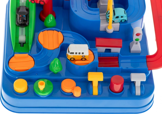 Podajte se na napeto vožnjo, polno presenečenj. Interaktivna proga z ovirami, dvižnim mostom in prenosi preveri spretnost in logično razmišljanje otrok. Upravljanje je preprosto in zabavno – z gumbi in vrtljivimi elementi premikate avtomobile po trasi in izpolnjujete naloge reševalnih služb.