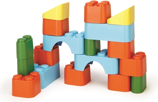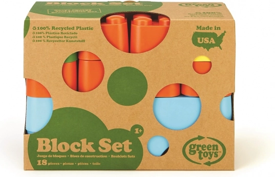 Ekološki gradbeni set Green Toys – 18 varnih kock iz reciklirane plastike. Lahke, čvrste, brez PVC, BPA in ftalatov. Primerno od 6 mesecev.